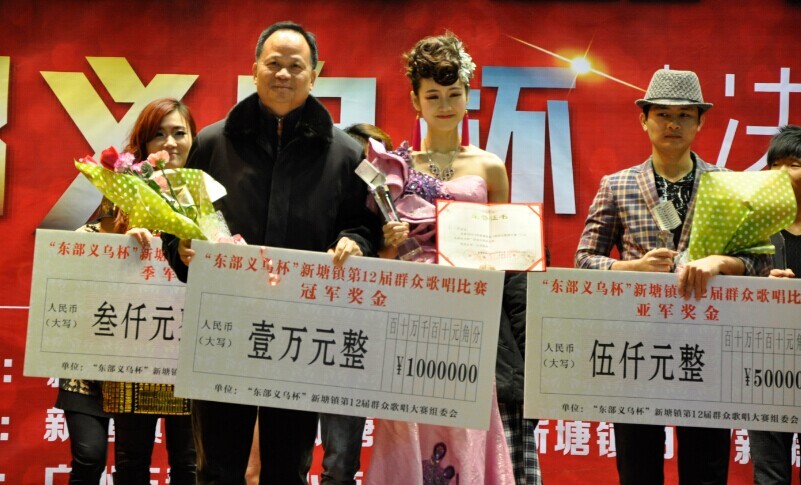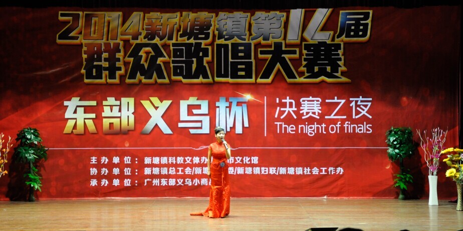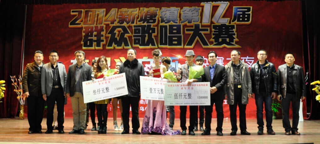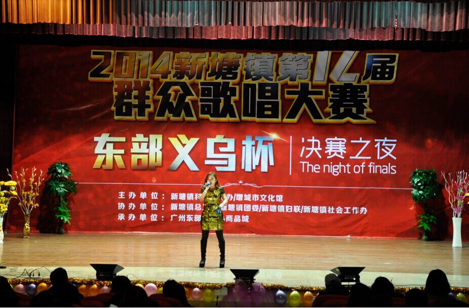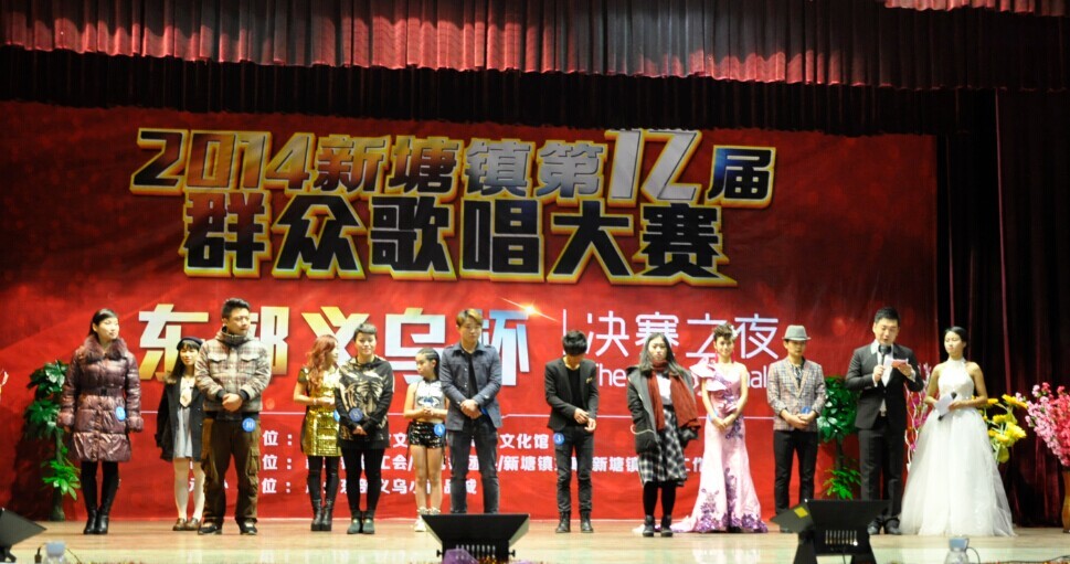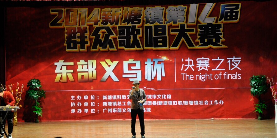 1月13日晚,新塘镇政府大院演艺中心歌声、掌声、欢呼声不绝于耳,2014新塘镇“广州东部义乌杯”群众歌唱大赛决赛落下帷幕。在149名初赛选手中精心挑选,经过初赛、复赛两轮比拼,12名选手进入决赛,争夺“广州东部义乌杯”群众歌唱大赛冠亚季军以及最佳台风奖、最佳人气奖、最佳新人奖。同时,广州东部义乌小商品城荣获“热心公益事业,情系群众文化”、“和谐共建文化新塘”的荣誉称号。