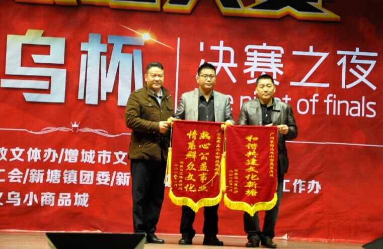 广州东部义乌小商品城荣获增城市文化体育局赠送的“热心公益事业,情系群众文化”锦旗和新塘镇人民政府赠送的“和谐共建文化新塘”锦旗,以鼓励和肯定广州东部义乌小商品城对此次比赛的冠名和组织工作。