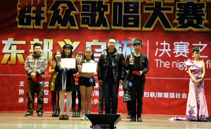 最后,由歌手彭小露取得冠军,钟志浩获得亚军,陈燕珊获得季军,胡丰庭获得最佳台风奖,骆栩瑶获得最佳人气奖、姚岚获得最佳新人奖,其余选手获得优秀奖。新塘镇政府工作人员、广州东部义乌小商品城庞勃总经理分别为冠亚季军颁发荣誉证书和现金大奖。广州东部义乌小商品城欧阳国林副总经理、曾智慧副总经理为最佳台风奖、最佳人气奖、最佳新人奖、优秀奖获得者颁奖。